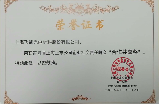 2018年12月28日,由上海证监局、上海市总工会、上海证券交易所指导,上海上市公司协会、第一财经、上海市经济团体联合会联合主办的“第四届上海上市公司企业社会责任峰会”在上海成功召开。飞凯材料凭借在社会责任方面的积极探索和不断努力,荣获第四届上海上市公司企业社会责任峰会“合作共赢奖”,公司副董事长、副总经理曹韻丽女士代表公司出席领奖。